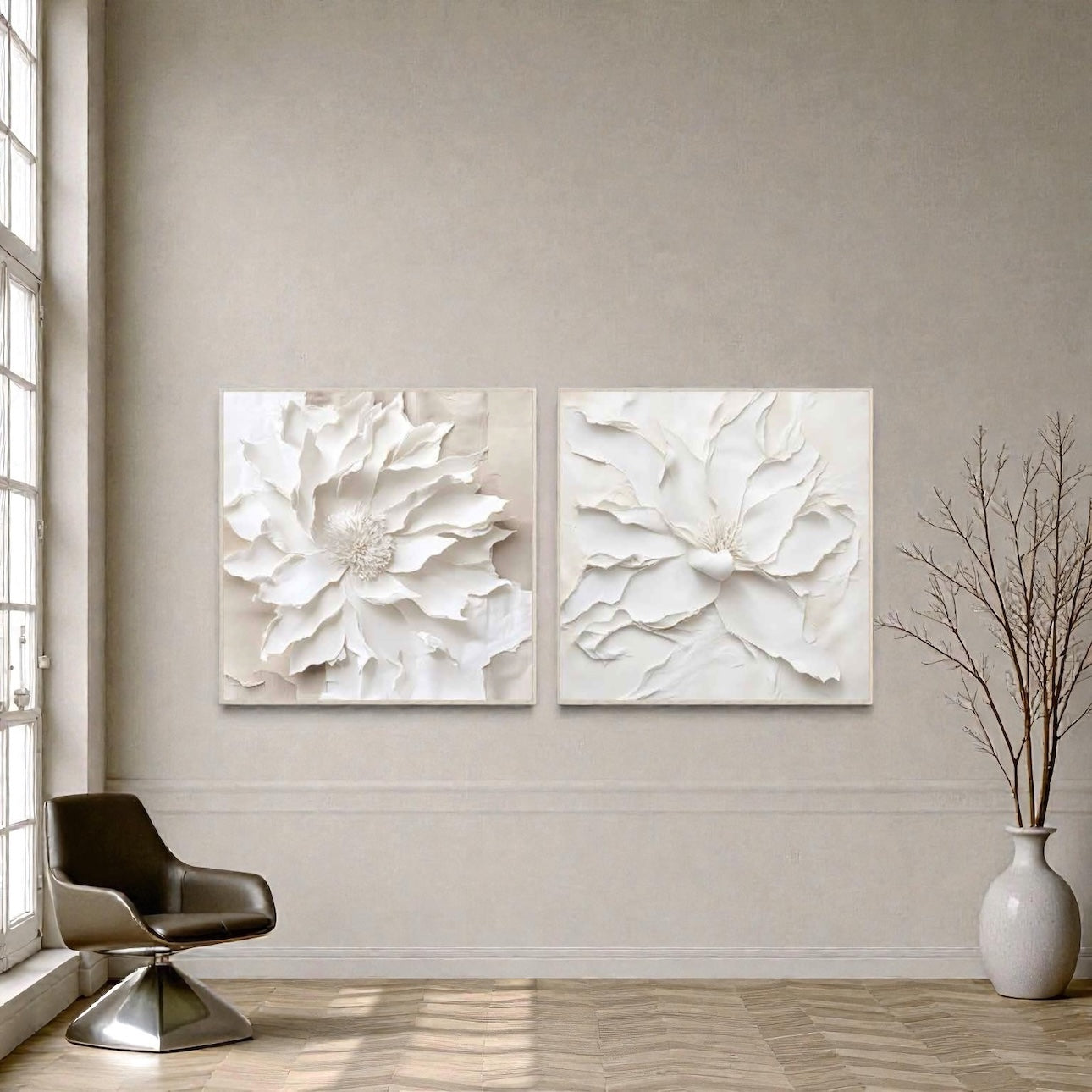Ethereal Petals II(エセリアル・ペタルズ II) は、純白の花びらを幾重にも重ね、まるで空気の層そのものを彫刻したかのような立体感を持つフラワーアートパネルです。