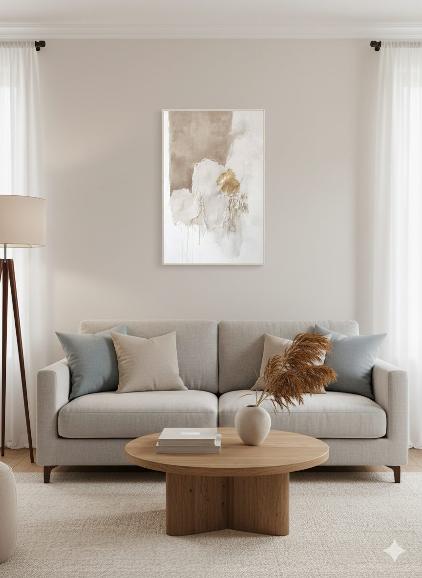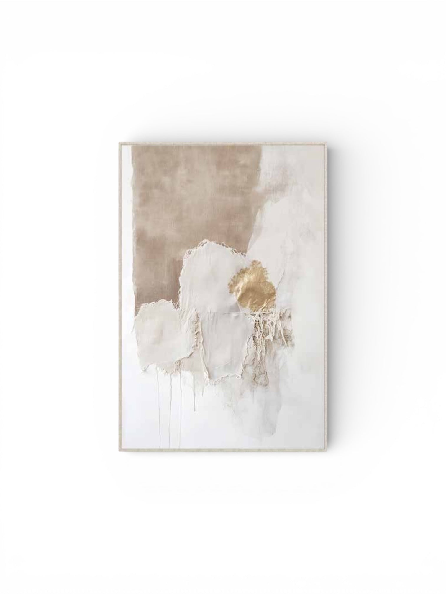 Golden Veil(ゴールデン・ヴェール) は、柔らかなニュートラルカラーのレイヤーと、上質なゴールドリーフを組み合わせた、静けさとラグジュアリーが同居する抽象アートパネルです。